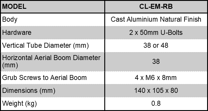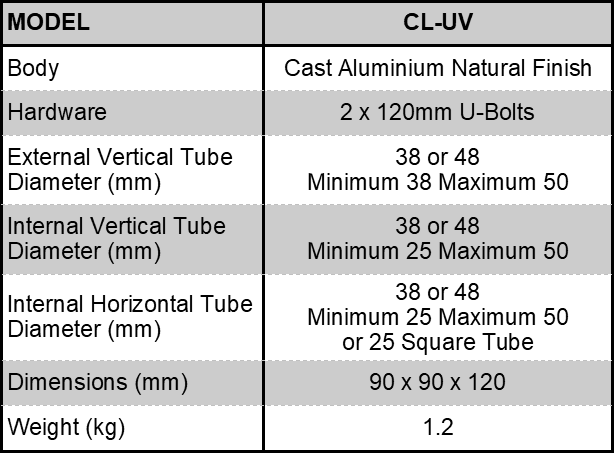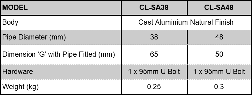 These clamps are a cast saddle with a U bolt for clamping tubes. Designed to mount aerials to 48mm and 38mm tubing. The saddles are made of cast aluminium with a natural finish. The U bolts are 8mm stainless steel fitted with M8 nuts and spring washers. A 95mm U-bolt is fitted as standard.