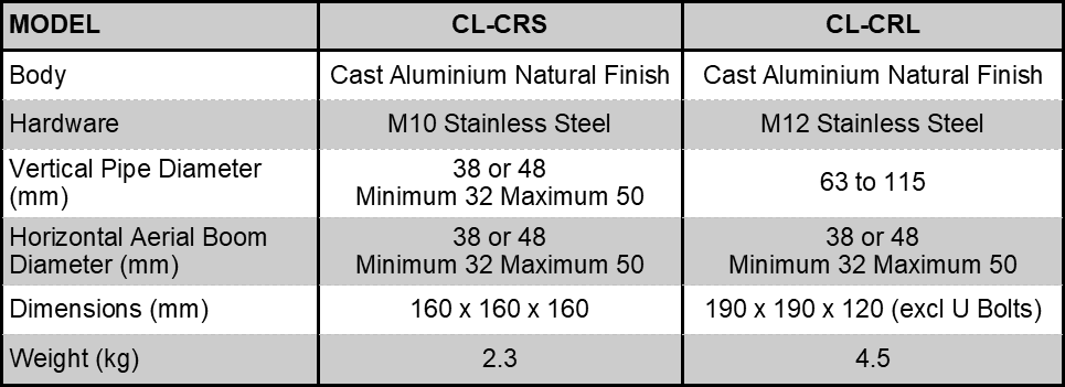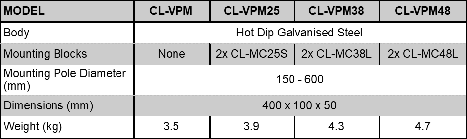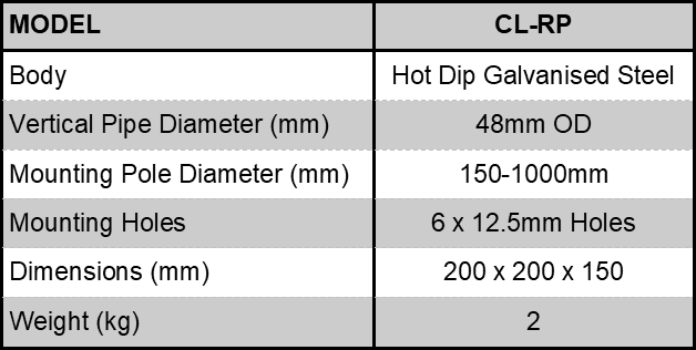 Designed to mount collinears to the top of a pole or dipoles to a wooden pole. The clamp is ruggedly constructed and is fixed to the pole with either bolts or coach bolts (not supplied).