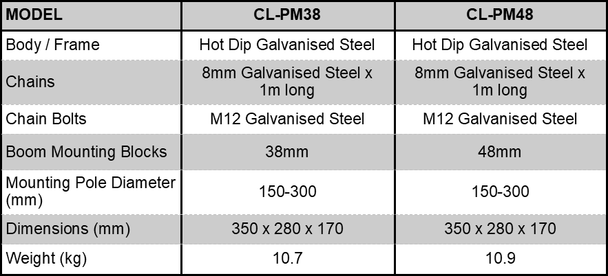 Designed to mount yagis or dipoles to a wooden pole. The clamp is ruggedly constructed and is fixed to the pole with adjustable chains, or with bolts. The aerial boom is easily clamped horizontally to the Pole Mount using saddle blocks bolted to its frame. A complete kit is supplied ready for installation.