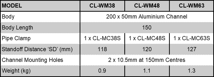 The wall mounts are designed for mounting vertical tubes or pipes to a vertical wall. The wall mount is available with mounting clamps to suit 38, 48 or 63mm OD tubes. These mounts can be used for either vertical or horizontal supports.