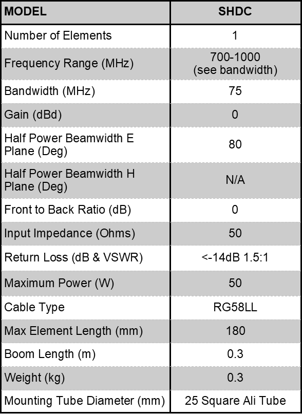 This UHF dipole antenna is designed for the 700-1000 MHz cellular, trunking and data bands. It is also ideally suited for STL links.