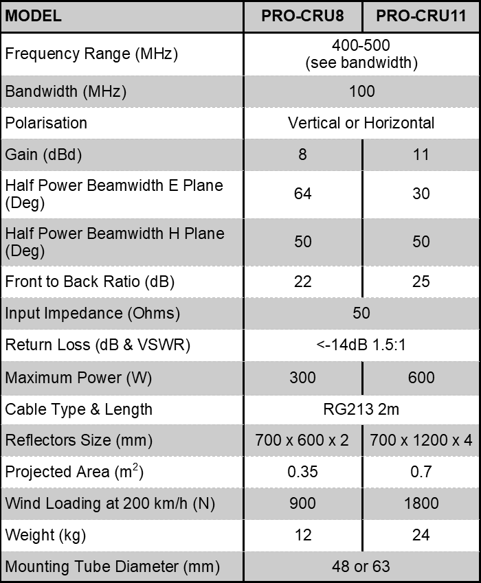 Series 6000 aluminium extrusion is utilised in the fabrication of the reflector framework. This framework is finished in a black powder coating to assist ice shedding. The support clamps for the framework are 63mm cast aluminium, these enable the antenna to be mounted in either a vertical or horizontal mode.