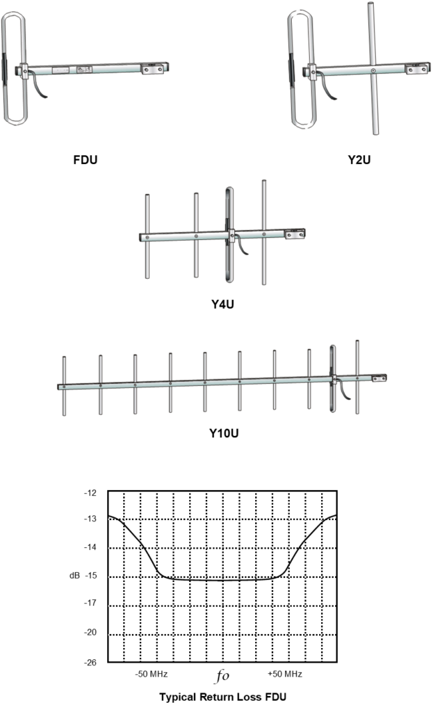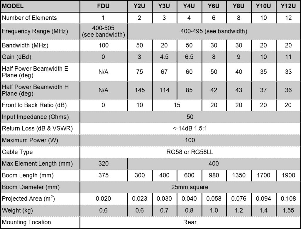 The standard range of UHF yagis and folded dipoles are designed for urban or rural site installations. Being lightweight with small projected surface areas, they can be installed on low cost supports. The coding “FD” indicates Folded Dipole and “Y” indicates Yagi.