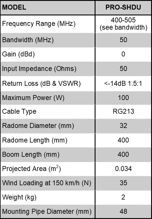 The dipole assembly is housed in a UV protected PVC plastic radome. The centre feed is taken out through a ‘tee’ attached to a 38mm OD x 3mm wall anodised aluminium boom. A RG213 coax tail is fed down the centre of the boom. The PRO-SHDU dipole is supplied with a fitted End Mount Clamp designed for mounting to a vertical 48mm OD tube.