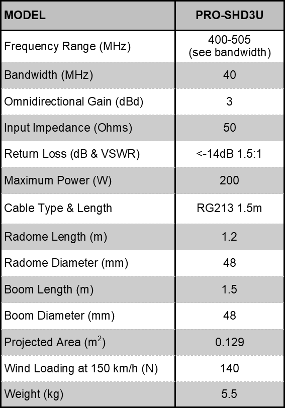 The shrouded dipole provides a rugged mechanical design with a reduced surface area, making it ideal for a harsh or marine environment. To achieve this, the dipole element is shrouded in a ‘pultruded’ fibreglass radome which is sheathed with black heat shrink to assist ice shedding.