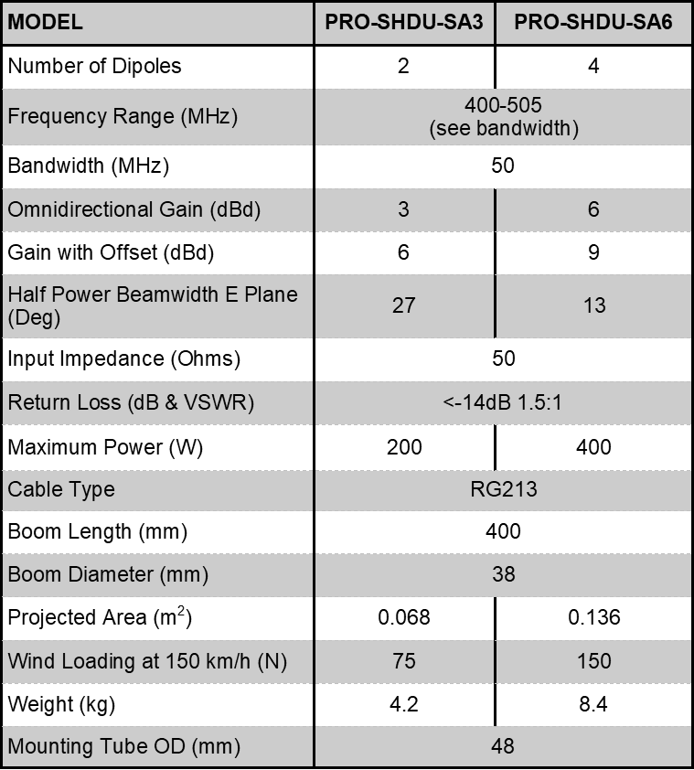 Items supplied for a PRO-SHDU-SA3 are 2 x dipoles (PRO-SHDU) and 1 x power divider (PD2)