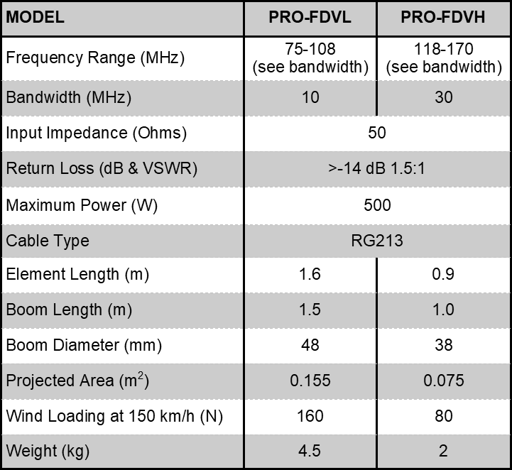 All models have vertically polarised radiation patterns which can be offset by locating the dipole at specific distances from a metallic support structure or by using a reflector. The folded dipole element is DC grounded.